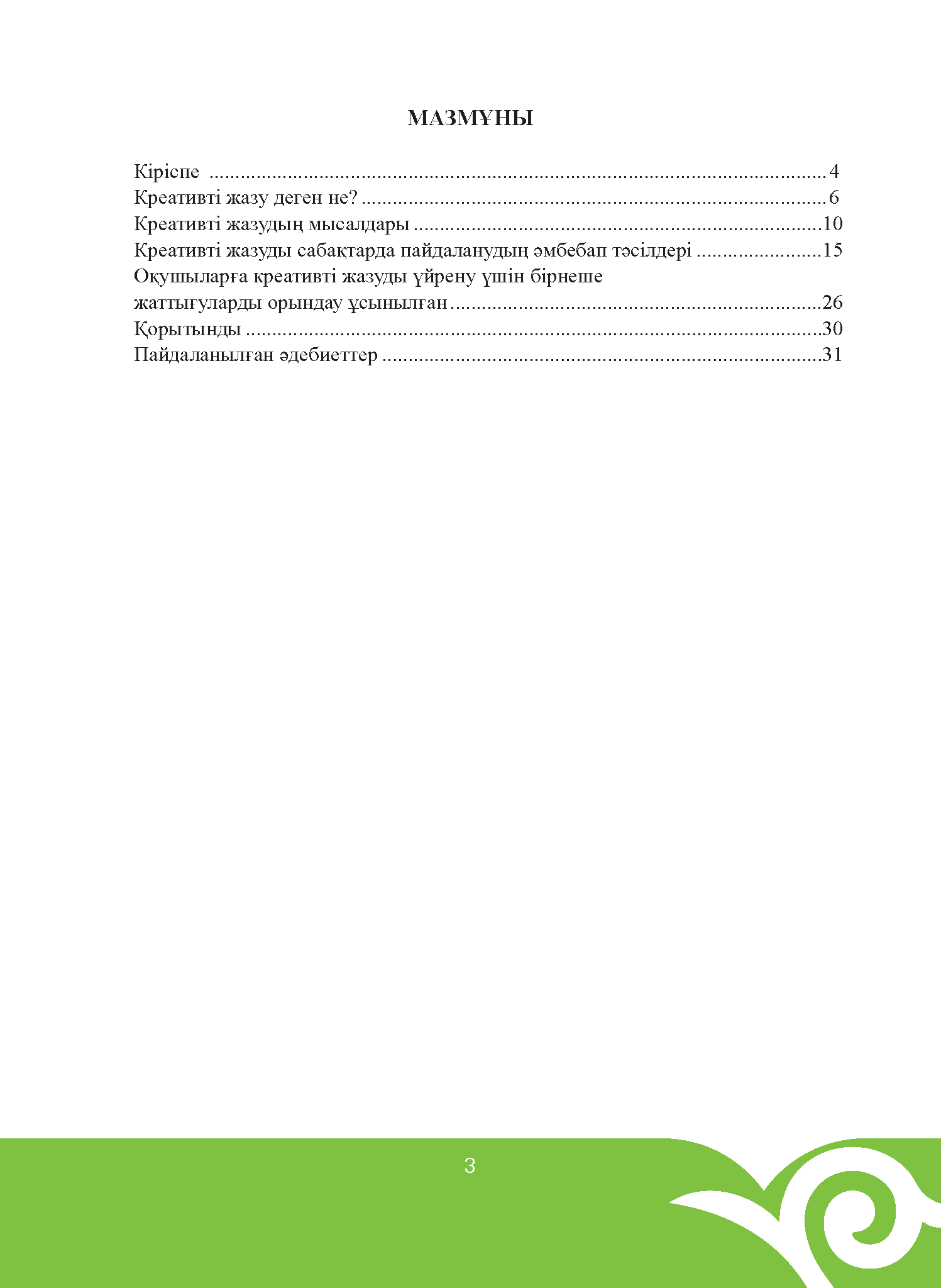 Әдістемелік нұсқаулықта креативті жазу туралы түсініктермен қатар сабақтарда креативті жазу техникасын пайдалану бойынша практикалық ұсыныстар, кеңестер берілген. Нұсқаулықта оқыту мен оқу үдерісінде креативті жазуды тиімді жоспарлап, іске асыруда қолданылатын әдіс-тәсілдер де ұсынылған. Берілген әдістемелік нұсқаулықты жалпы білім бере¬тін мектептердің барлық пәндері мен сыныптарында, сондай-ақ мектепалды даярлық сыныптарының мұғалімдеріне де пайдалануға болады.