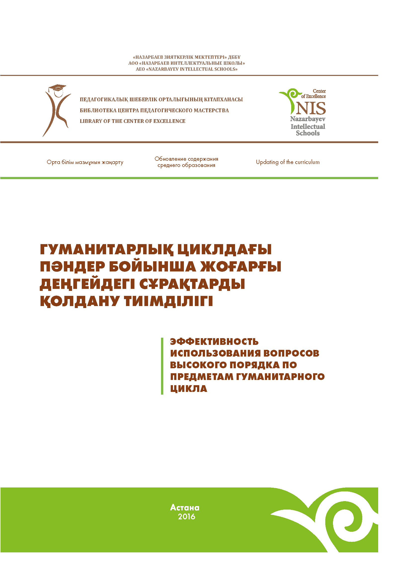 Гуманитарлық циклдағы пәндер бойынша жоғарғы деңгейдегі сұрақтарды қолдану тиімділігі. Әдістемелік ұсыным/А.Ж. Купешова, Н.М. Султанбекова, А.А. Керимбаева – Астана: «Назарбаев Зияткерлік мектептері» ДББҰ Педагогикалық шеберлік орталығы, 2016. – 40 б.