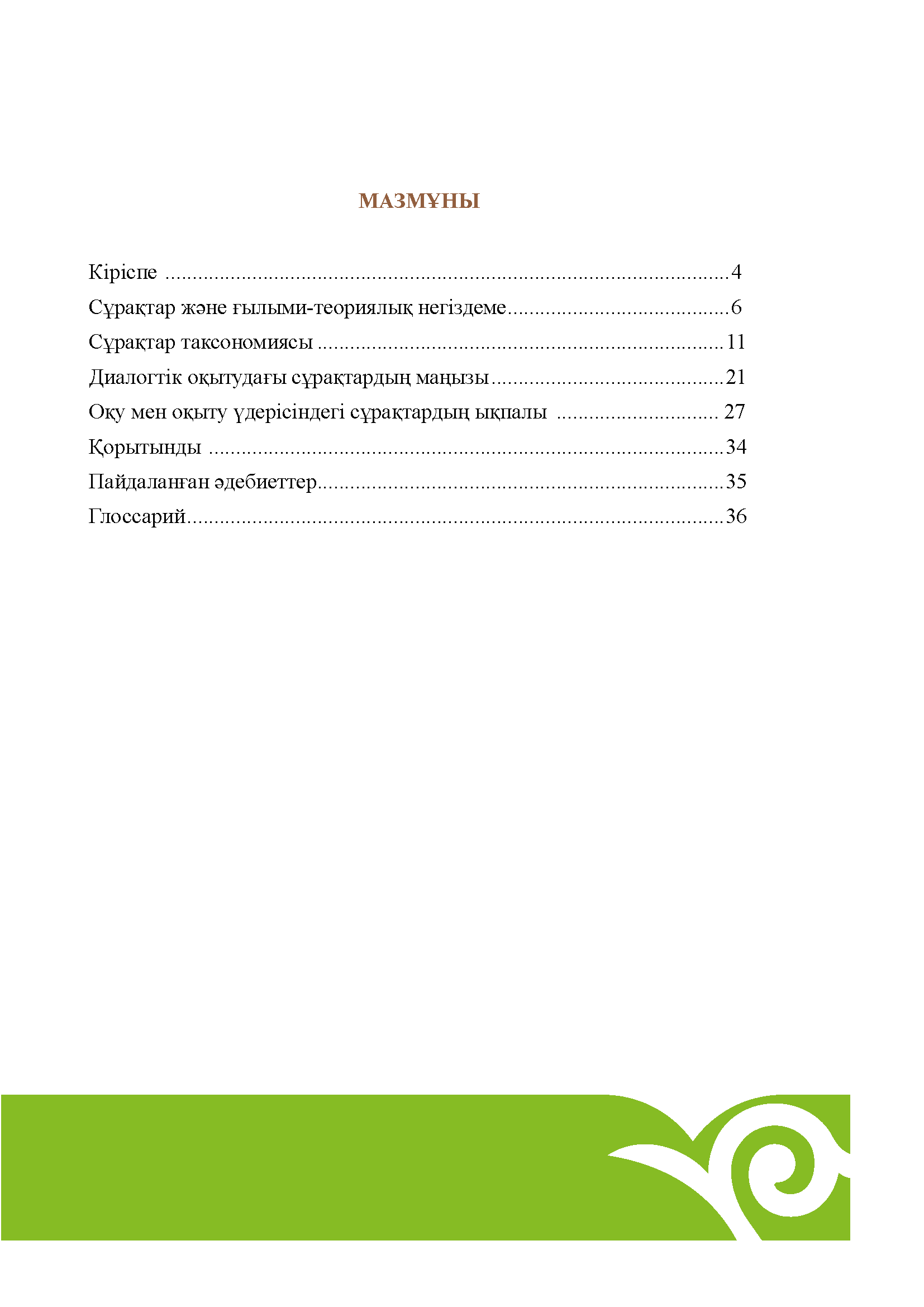 Бұл әдістемелік басылымда оқыту мен оқу үдерісінде сұрақтарды қолданудың түрлі мәселелері қарастырылады, мектеп мұғалімдеріне оқушылардың белсенділігін арттыруға ықпал ететін жаттығулар мен стратегияларды қолдану бойынша ұсынымдар беріледі.