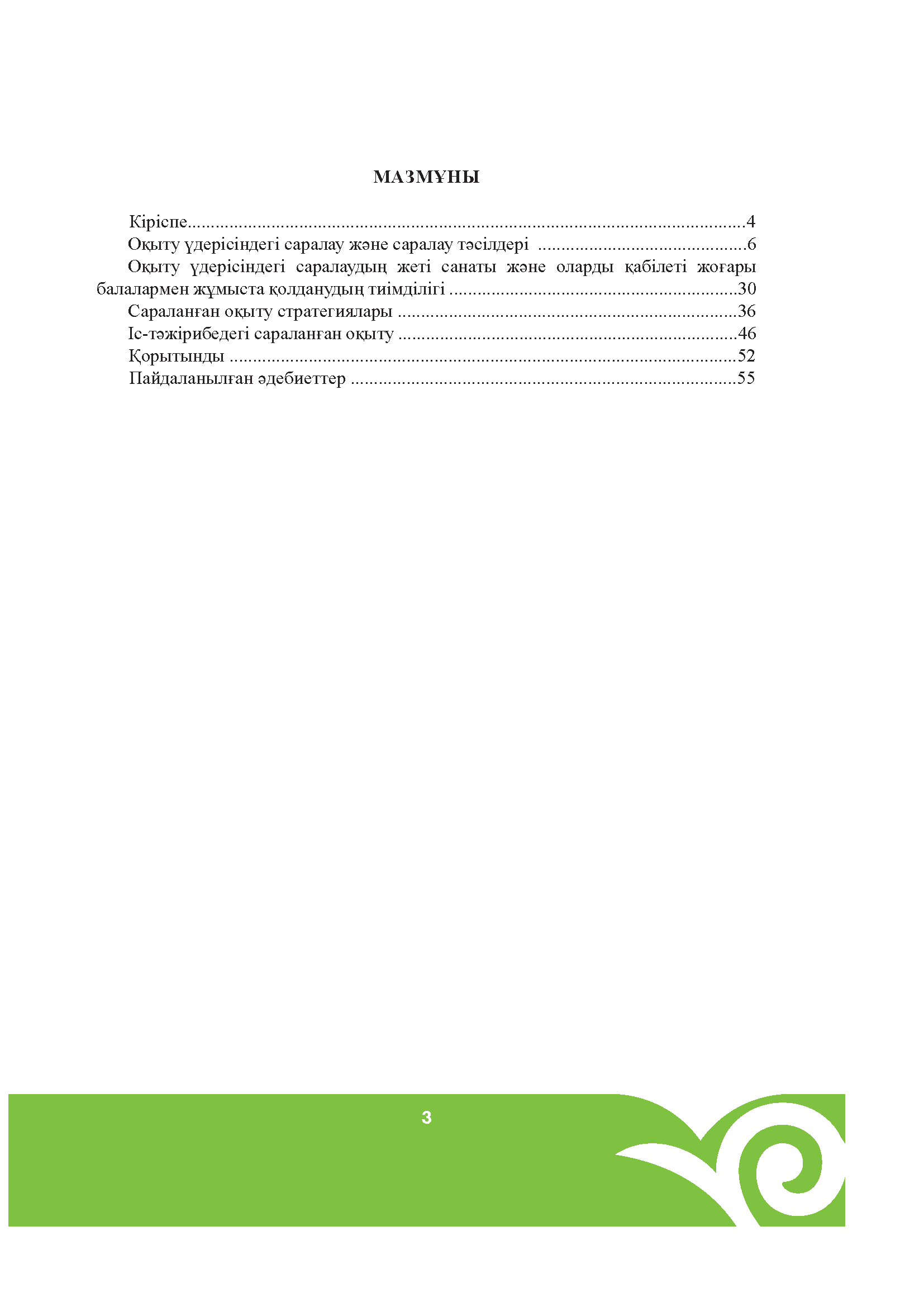 Бұл әдістемелік нұсқаулықта оқыту мен оқу үдерісінде саралау әдістерін тиімді қолдану жолдары кеңінен қарастырылған. Нұсқаулықта ұсынылған сараланған тәсілдер мұғалімнің оқыту тәжірибесі мен білім беру сапасын жақсартуға ықпал етеді. Нұсқаулықта саралап оқытудың оқушының оқу нәтижесін арттырудағы тиімділігі мен маңызы көрсетілген.