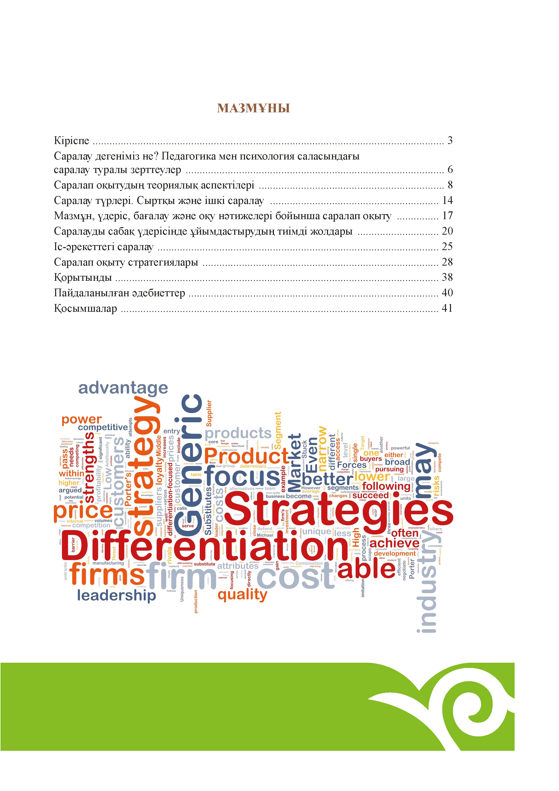 Әдістемелік нұсқаулықта саралап оқытудың теориялық аспектісі және сабақ үдерісінде саралап оқытуды ұйымдастырудың тиімді жолдары, олардың тұлғаның дамуындағы рөлі қарастырылады. Нұсқаулықта өз оқушыларының қажеттілігі, деңгейі мен қабілеттерін ескере отырып жоспарлауда қолданылатын стратегиялар ұсынылады.