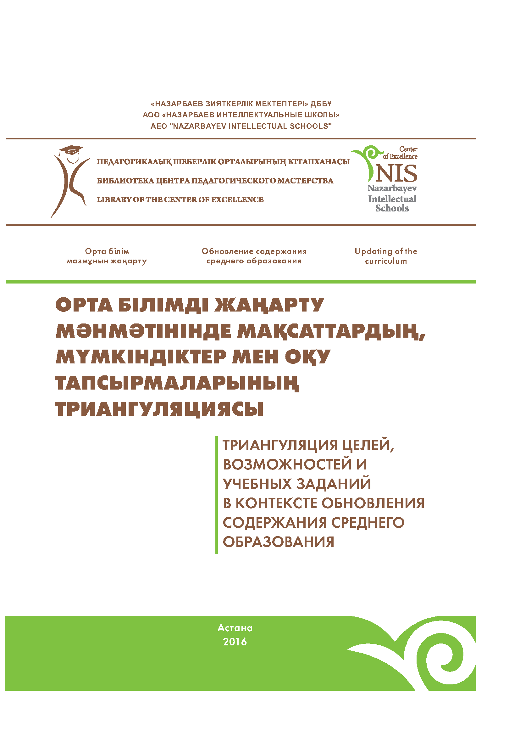 Орта білім мазмұнын жаңарту мәнмәтінінде мақсаттардың, мүмкіндіктер мен оқу тапсырмаларының триангуляциясы: әдіст. құрал/Л.Е. Абакиева, Д.Ж. Жалетова. – Астана: «Назарбаев Зияткерлік мектептері» ДББҰ Педагогикалық шеберлік орталығы, 2016. – 40 б.