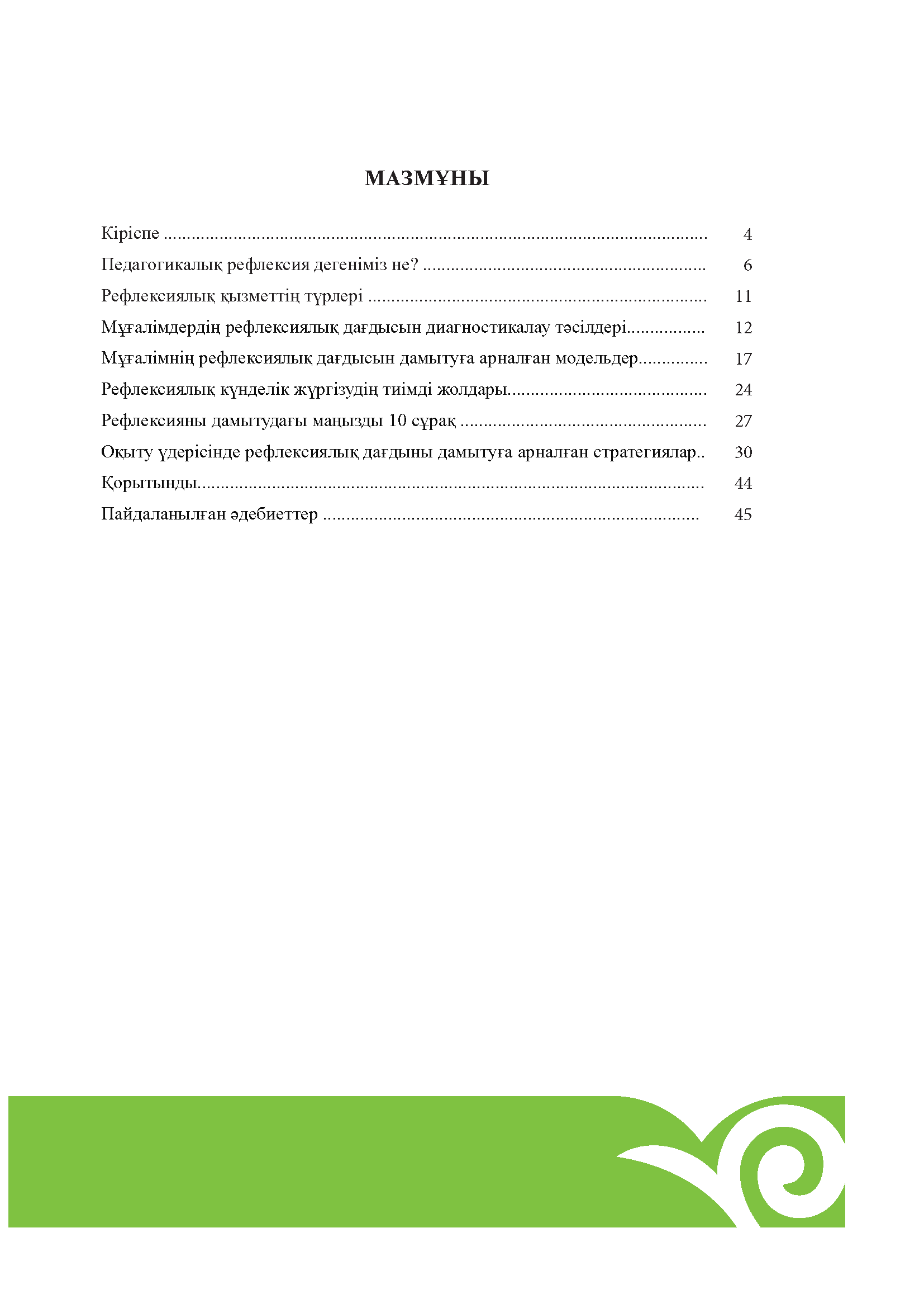 Әдістемелік нұсқаулықта өз тәжірибесін шынайы әрі сыни бағалауға дайын, оқушылары мен өзін кәсіби дамытуға мүдделі мұғалімдерге өзіндік рефлексияны дамытуға арналған бірнеше әдіс- тәсілдер мен формалар қарастырылады.