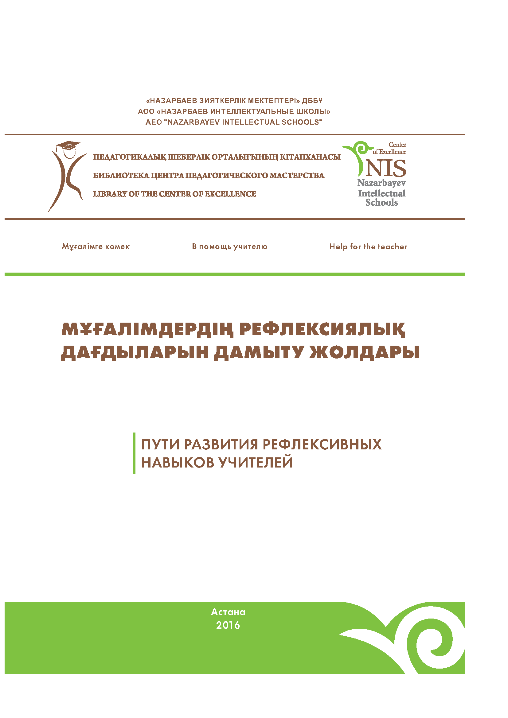 Мұғалімдердің рефлексиялық дағдыларын дамыту жолдары: әдістемелік нұсқаулық./ Қ.С. Абдраманова, Ж.Д. Джансугирова, Б.Қ. Дильманов, Е.Т. Оспанов. – Астана: «Назарбаев Зияткерлік мектептері» ДББҰ Педагогикалық шеберлік орталығы, 2016. – 46 б.