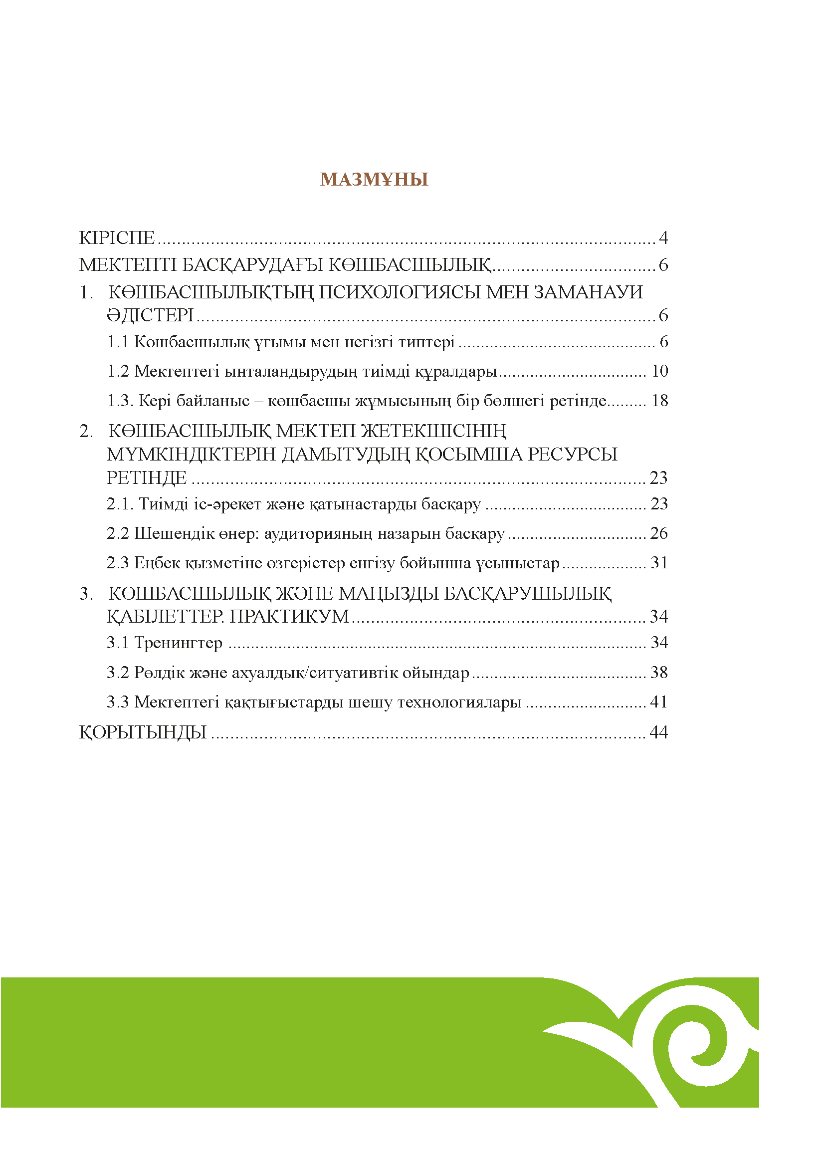Ұсынылып отырған әдістемелік құралда заманауи мектепте көшбасшылықты дамыту жолдары қарастырылған. Әдістемелік құрал тарауларында көшбасшы ретінде педагогикалық ұжымды тиімді басқару бағытындағы теориялық ресурстар мен әртүрлі әдіс-тәсіл жүйеленген.