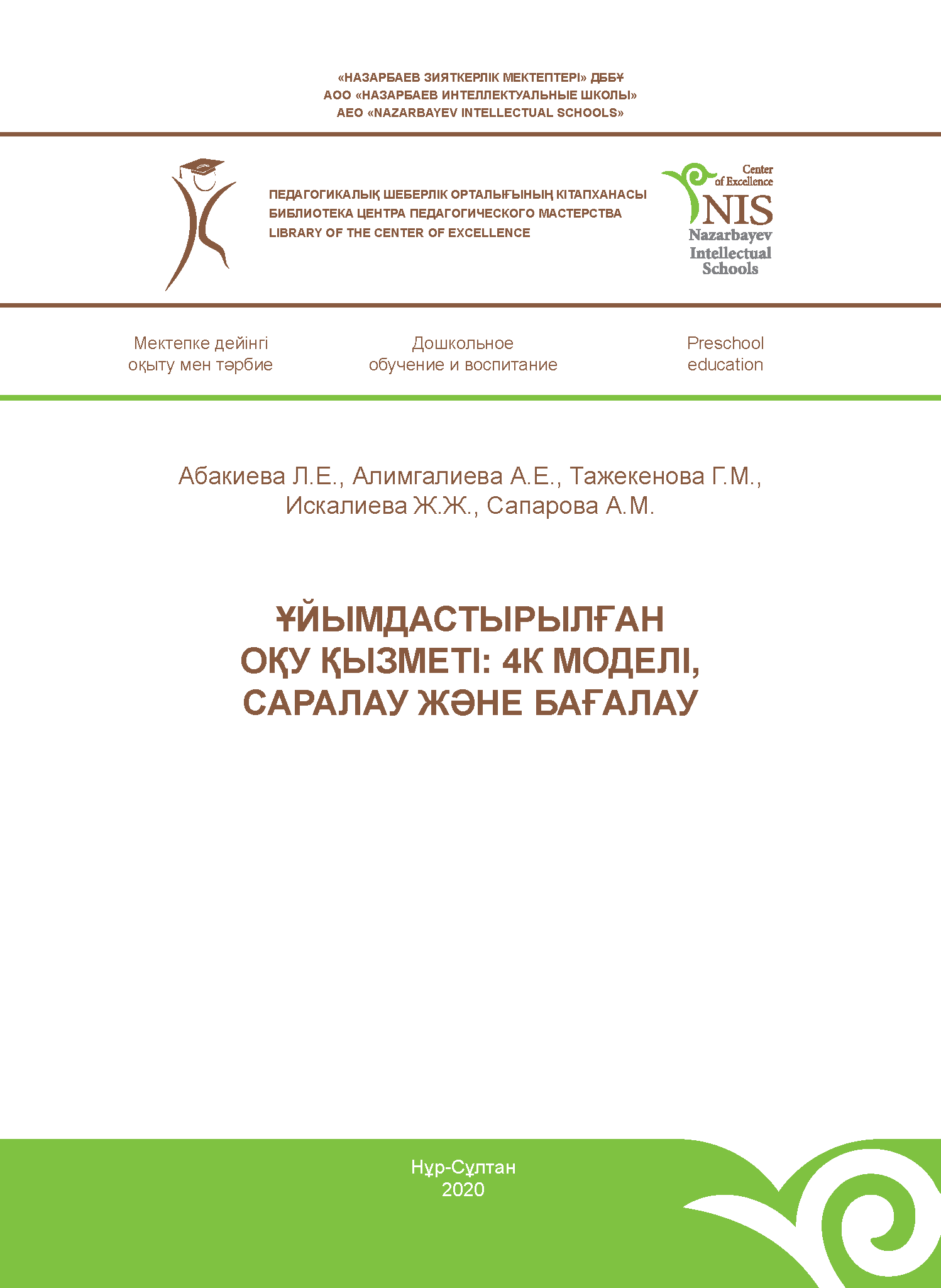 Ұйымдастырылған оқу қызметі: 4К моделі, саралау және бағалау/Л.Е. Абакиева, А.Е. Алимгалиева, Г.М. Тажекенова, Ж.Ж. Искалиева, А.М. Сапарова. – Нұр-Сұлтан: «Назарбаев Зияткерлік мектептері» ДББҰ Педагогикалық шеберлік орталығы, 2020. – 60 б.